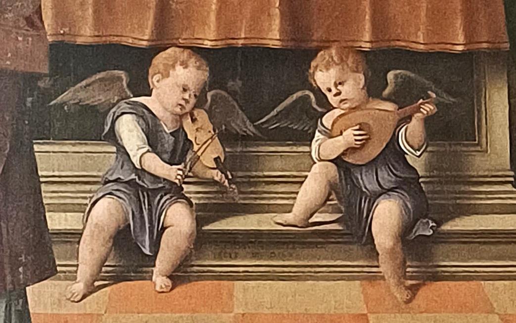 Ai lati ci sono San Nicola con la caratteristica talare vescovile, il bastone pastorale e le tre sfere d’oro, e San Giovanni Battista con gli attributi tipici dell’iconografia cristiana, ovvero: abiti semplici da ascetico, il bastone a forma di croce e il dito indicante, accompagnato dalla scritta “Ecce Agnus Dei”. Il tutto tratteggiato sopra una pavimentazione a scacchi bianca e rossa, per conferire profondità alla rappresentazione. Ai piedi del trono, due putti suonatori incorniciano la dicitura contenente la firma e la data menzionate in precedenza e costituiscono, tra l’altro, loro stessi un “marchio di fabbrica” dei Santacroce, dato che si ripresentano con insistenza in altri dipinti (anche nel polittico di Castellana, vd. supra). Inoltre, riteniamo che possano essere un rimando e un omaggio allo stesso maestro, Giovanni Bellini, ma anche a grandi artisti già affermati all’epoca, come: Raffaello, Rosso Fiorentino, Melozzo da Forlì e molti pittori fiamminghi, primo fra tutti Jan van Eyck.