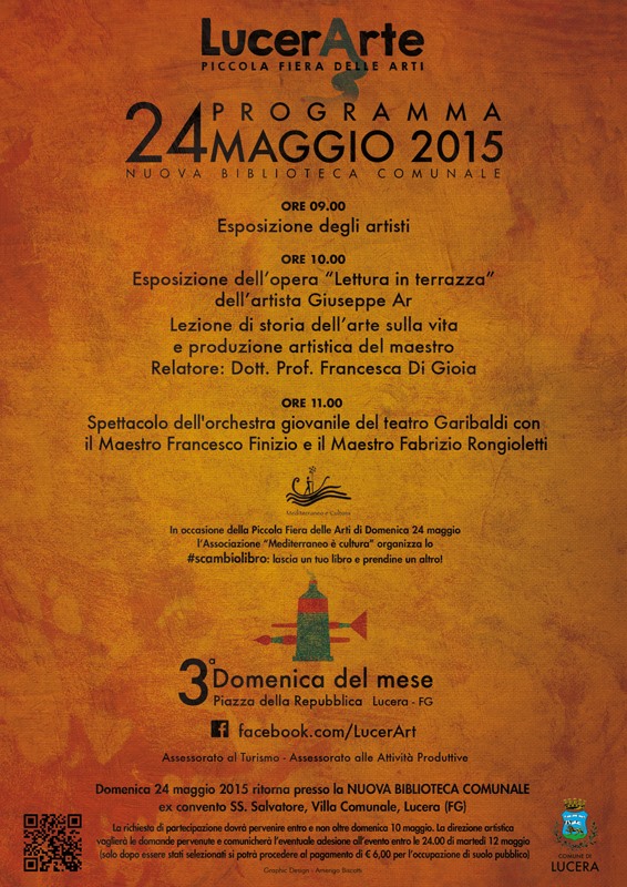 Domenica 24 maggio 2015, torna l’appuntamento con LucerArte piccola fiera delle Arti, che si terrà questa volta eccezionalmente presso la nuova biblioteca comunale ex convento SS. Salvatore, Villa Comunale Lucera.
