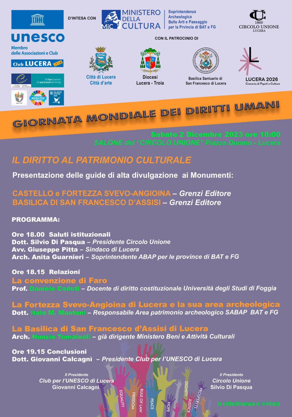 In occasione della GIORNATA MONDIALE DEI DIRITTI UMANI – CONVENZIONE DI FARO – IL DIRITTO AL PATRIMONIO CULTURALE, il Club UNESCO di Lucera organizza un convegno pubblico su: “IL DIRITTO AL PATRIMONIO CULTURALE” con la presentazione di DUE GUIDE DI ALTA DIVULGAZIONE, relative a due importanti monumenti del nostro territorio: