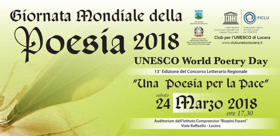 La Poesia svolge un ruolo fondamentale nella promozione del dialogo e della comprensione interculturali, della diversità linguistica e culturale, della comunicazione e della pace. Nella consapevolezza di tale missione, sabato 24 marzo 2018, alle ore 17,30 il Club per l’UNESCO di Lucera, presieduto dal prof. Giovanni Calcagnì, celebra la Giornata Mondiale della Poesia presso l’Auditorium dell’Istituto Comprensivo “Bozzini-Fasani” di Lucera, presieduto dal Dirigente Scolastico prof. Mario Tibelli.