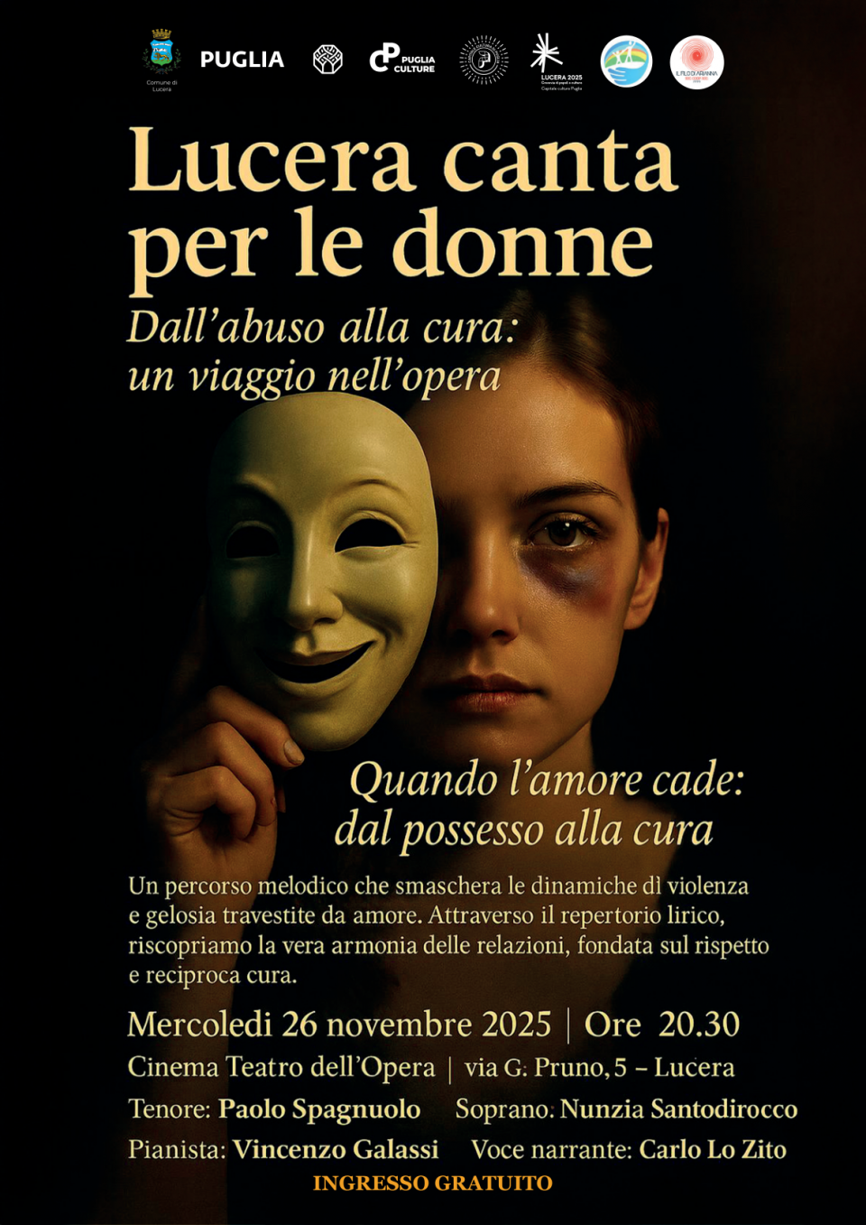 In occasione della Giornata internazionale per l’eliminazione della violenza contro le donne, il Comune di Lucera – in collaborazione con l’Ambito territoriale “Appennino Dauno Settentrionale”, il Centro Antiviolenza “Giovanna Tanese” e la cooperativa sociale “Il Filo di Arianna”, soggetto promotore – promuove per la serata di martedì 26 novembre un recital lirico dal forte valore simbolico e civile.