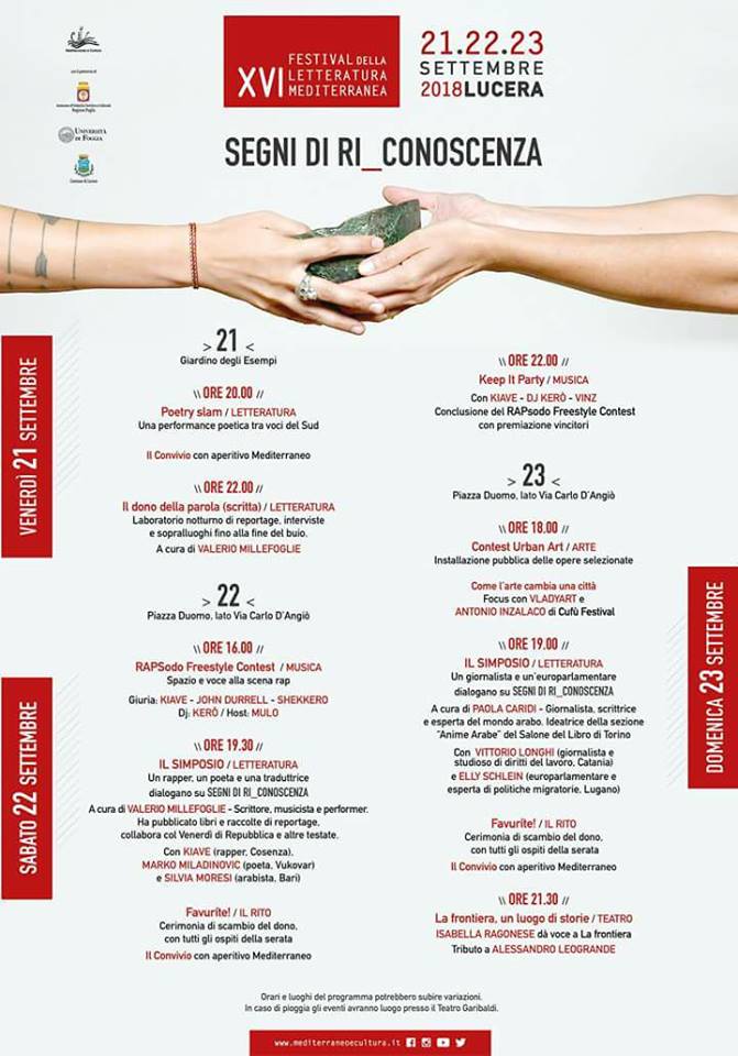 A Lucera è di nuovo tempo di Festival della Letteratura Mediterranea. Dal 21 al 23 settembre prossimi andrà in scena la XVI edizione, con un programma multidisciplinare, pensato per il dialogo tra i linguaggi espressivi e tra i loro creatori. Tutti gli ospiti porteranno le proprie esperienze e i propri “segni”, intesi come messaggi positivi e utili alla lettura del nostro presente complesso.