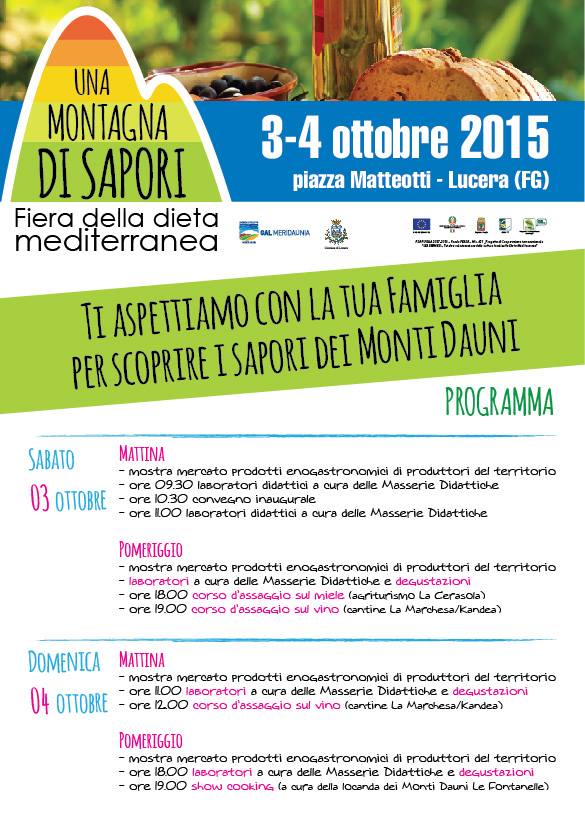 Si terrà in Piazza Matteotti, nel weekend compreso tra sabato 3 e domenica 4 ottobre, la Fiera della dieta mediterranea, organizzata dal GAL Meridaunia in collaborazione con il Comune di Lucera, le masserie didattiche e le scuole primarie dei Monti Dauni.