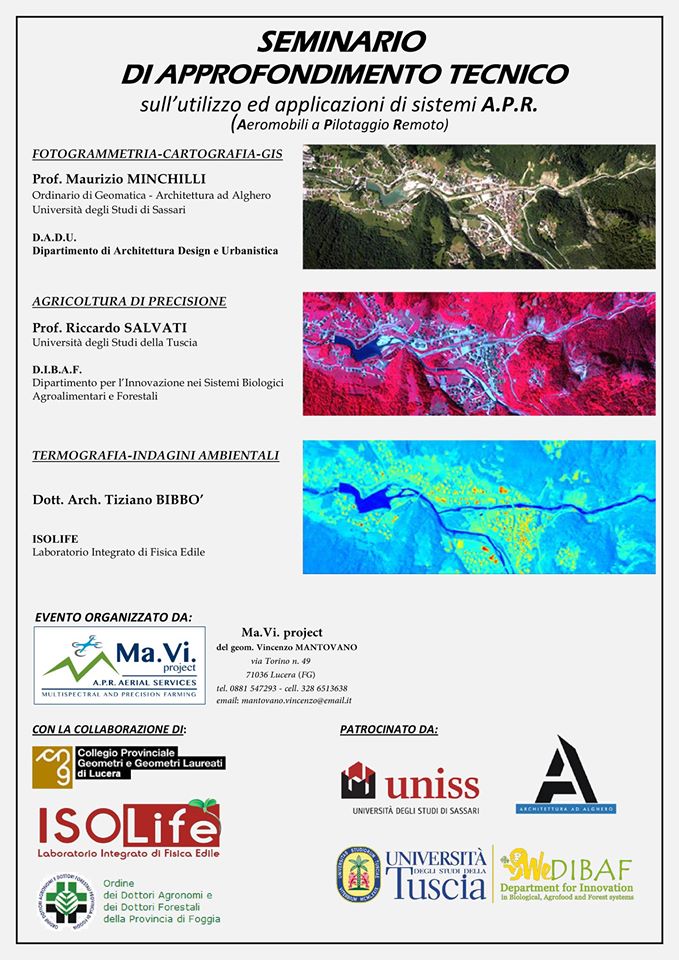 Si terrà venerdì 29 luglio, dalle ore 8.30 alle ore 13.30, presso il Collegio dei Geometri di Lucera, un Seminario di approndimento tecnico sull’utilizzo e l’applicazione dei sistemi A.P.R. (Aeromobili a Pilotaggio Remoto, comunemente detti droni).