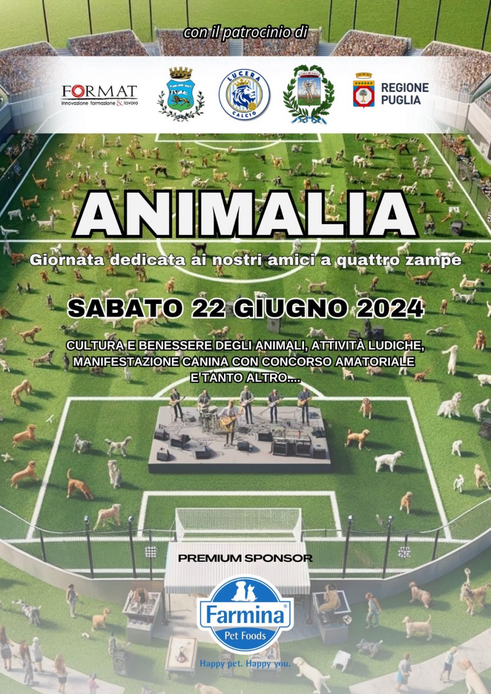 Si terrà sabato 22 Giugno 2024 dalle 10 alle 22 presso lo Stadio Comunale di Lucera (ingresso libero) l’evento “ANIMALIA”, un’iniziativa dedicata alla celebrazione e al benessere degli animali da compagnia, organizzata dall’ente di formazione Format con l’Asd Lucera Calcio, sponsorizzato da FARMINA e patrocinato dal Comune di Lucera, dalla Provincia di Foggia e dalla Regione Puglia.