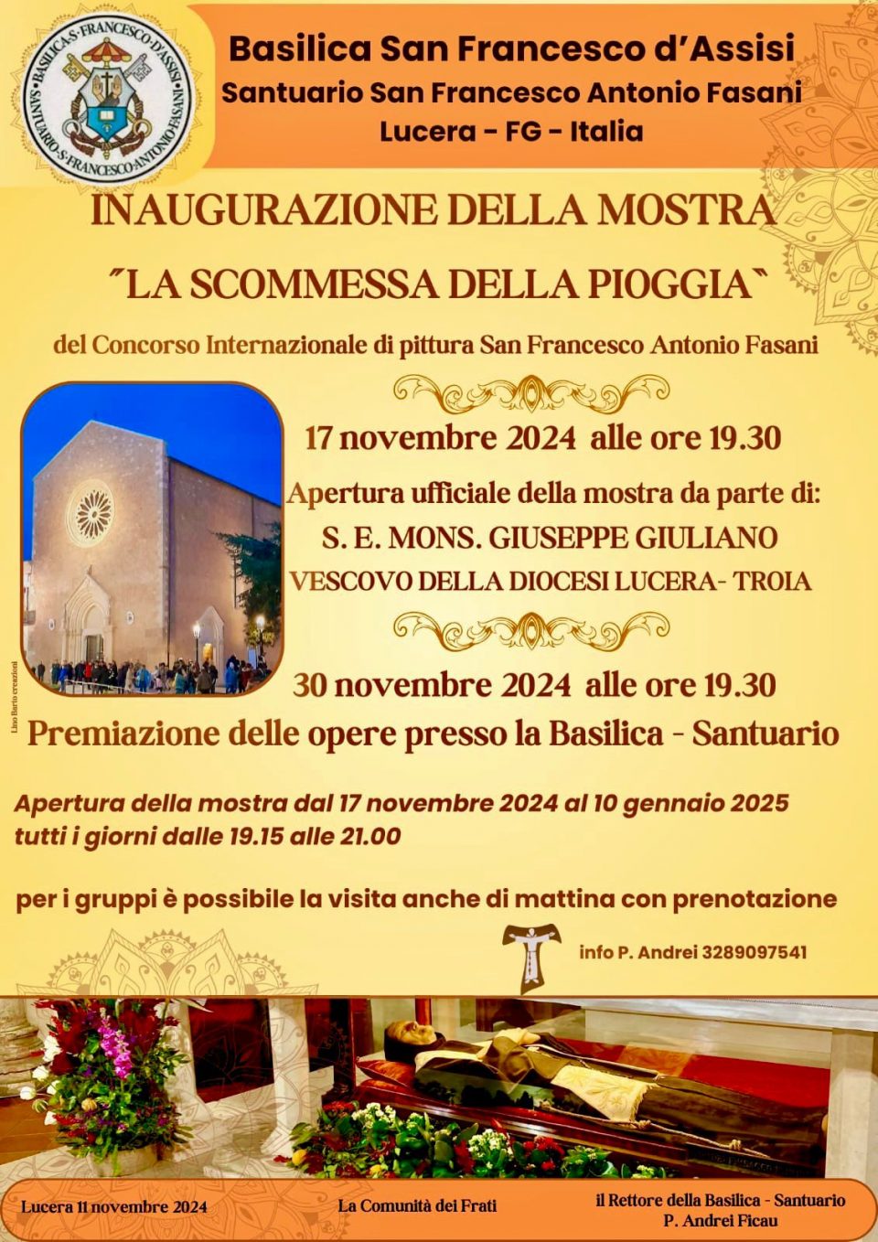 I quadri saranno esposti nella mostra che sarà allestita nella Basilica di San Francesco di Lucera sino al 10 gennaio 2025, con inaugurazione il 17 novembre 2024, domenica, alle ore 19,30, da parte del Vescovo della Diocesi di Lucera – Troia , S.E. Mons. Giuseppe Giuliano.