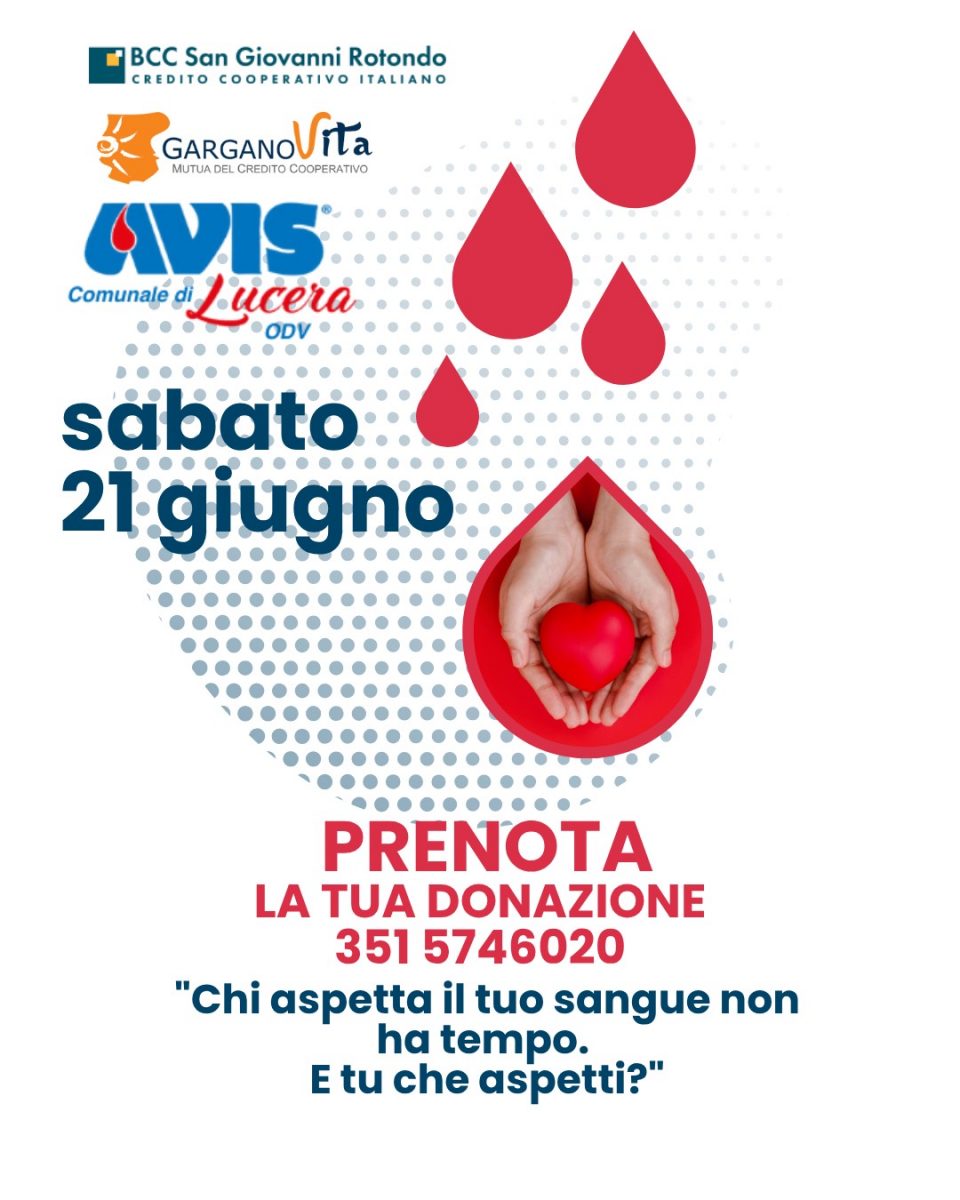 L’AVIS Comunale di Lucera ODV, in collaborazione con la Banca di Credito Cooperativo di Lucera, promuove una giornata di donazione del sangue sabato 21 giugno 2025, dalle ore 8:30 alle ore 11:30, presso la filiale della BCC di Lucera.