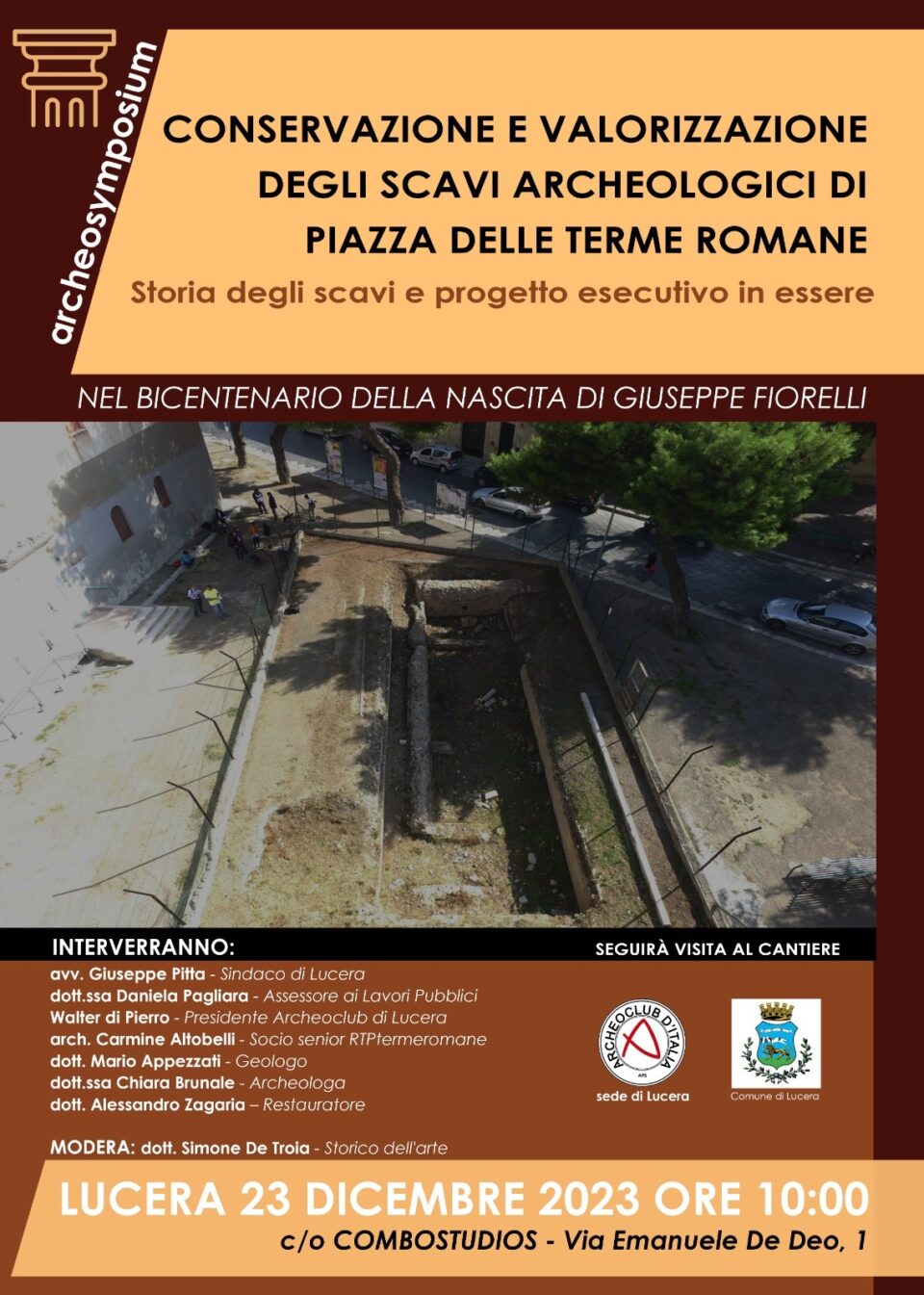 Al termine della conferenza, patrocinata dal Comune di Lucera, ci si sposterà all’esterno per effettuare un sopralluogo al cantiere di piazza delle Terme Romane.