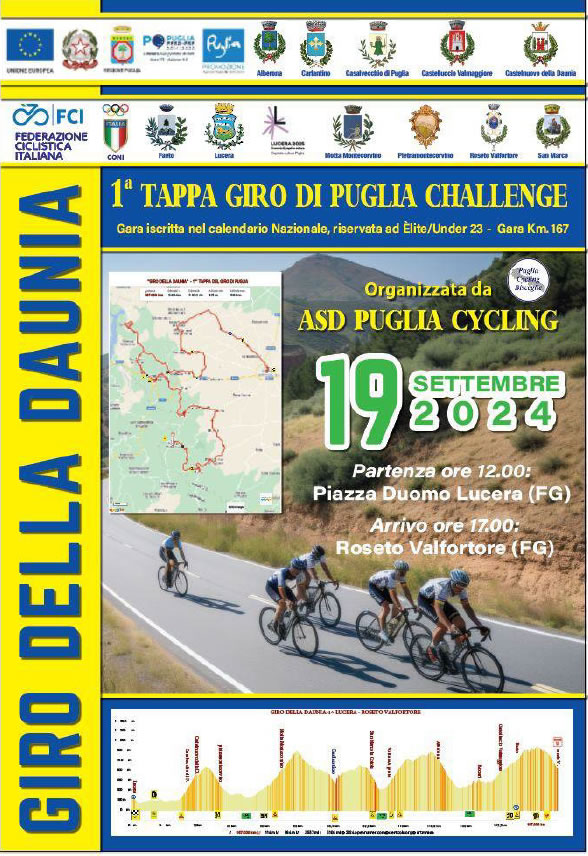 E’ il primo appuntamento delle 4 tappe pugliesi, la tappa avrà il proprio arrivo, stimato alle 16,30 del 19 settembre, nella cittadina di Roseto Valfortore e attraverserà i 13 paesi aderenti alla convenzione sottoscritta con “ADS Puglia Cycling” e il “Consorzio Puglia Bici e Futuro”, in collaborazione con la Regione Puglia.