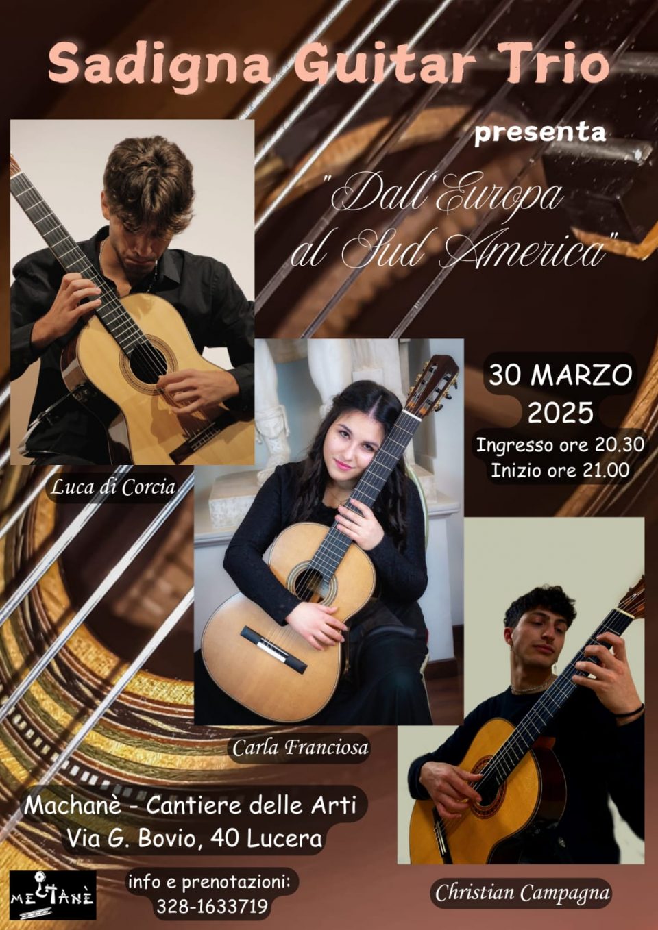 Il prossimo concerto dei “Sadigna Guitar Trio” sarà domenica 30 marzo 2025, presso Mechanè – cantiere delle Arti, Via Bovio, 40 a Lucera. Ingresso solo su prenotazione alle ore 20:30, con inizio alle ore 21:00.