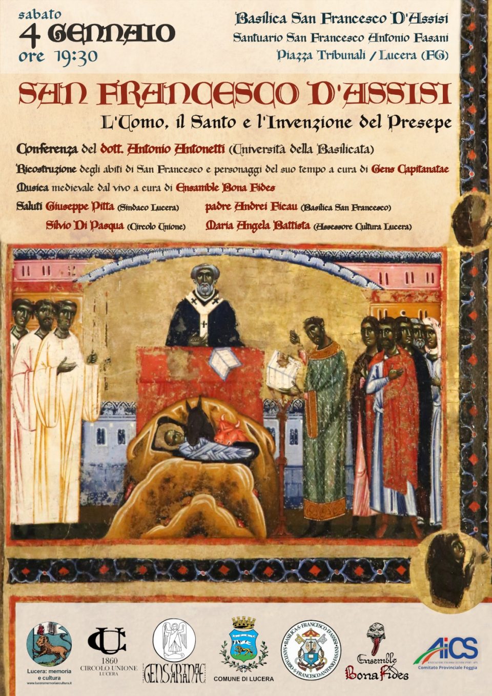 L’evento, patrocinato dal Comune di Lucera e sostenuto dal Circolo Unione di Lucera, l’Associazione Italiana Cultura e Sport – Comitato provinciale di Foggia e dal blog “Lucera: memoria e cultura”, rappresenta un’importante occasione per approfondire la figura di San Francesco, valorizzandone il lascito storico e spirituale attraverso un percorso tra cultura, musica e tradizione.