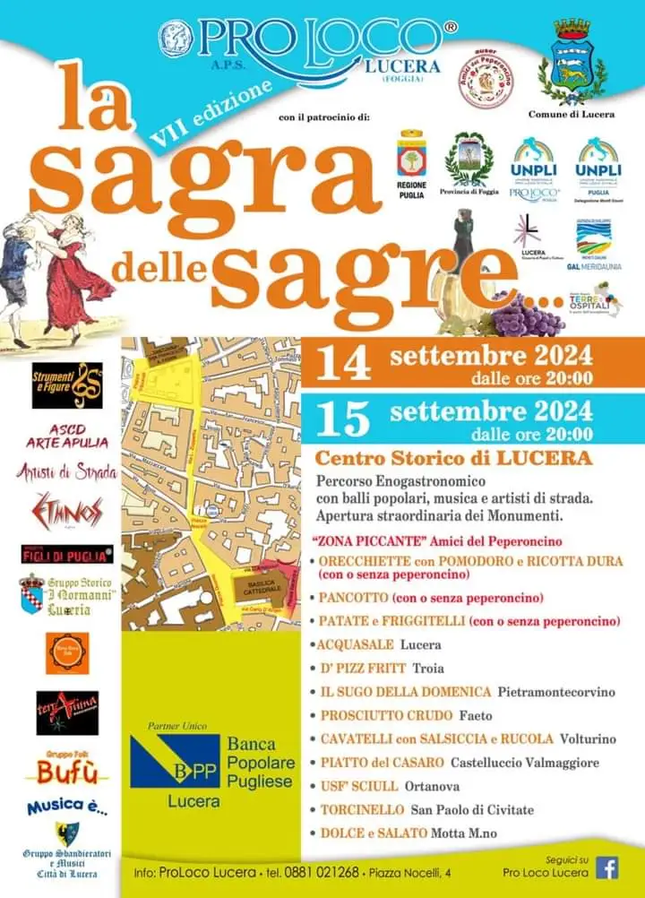 Si esibiranno gli Artisti di Strada, il gruppo Ethnos, Figli di Puglia, Gruppo storico I Normanni, Terra Terra Folk, TerrAnima, Gruppo folk Bufù, Musica è…, Ascd Arte Apulia, Gruppo Sbandieratori e Musici Città di Lucera. La Sagra delle Sagre, promossa dalla Pro Loco di Lucera presieduta da Stefano Ciccarelli, gode del patrocinio e della collaborazione del Comune di Lucera, Amici del Peperoncino, Regione Puglia, Provincia di Foggia, Unpli nazionale e Unpli Puglia Delegazione Monti Dauni, Lucera – Crocevia di Popoli e Culture, Gal Meridaunia e Terre Ospitali.