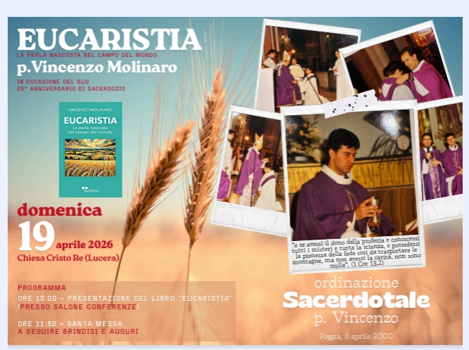Domenica 19 aprile 2026 la comunità parrocchiale e cittadina vivrà un momento di grande valore culturale e spirituale in occasione della presentazione del libro scritto da Padre Vincenzo Molinaro, sacerdote dei Giuseppini del Murialdo, dal titolo “L’Eucaristia, la perla nascosta nel campo del mondo”.