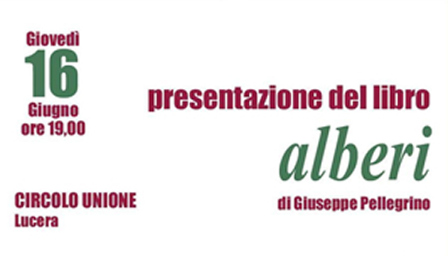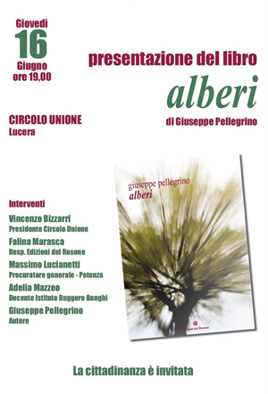 Alberi di Giuseppe PellegrinoIncontro culturale in programma questa sera alle ore 19.00 presso il Circolo Unione di Lucera per la presentazione del volume di poesie “ALBERI” del Dott. Giuseppe Pellegrino, già Presidente del Tribunale di Lucera e della Corte di Appello di Potenza. Relatori della serata  saranno la prof.ssa Falina Marasca (Edizioni del Rosone), la prof.ssa Adelia Mazzeo (Istituto Ruggero Bonghi) e il dott. Massimo Lucianetti (Procuratore Generale della Corte di Appello di Potenza).
