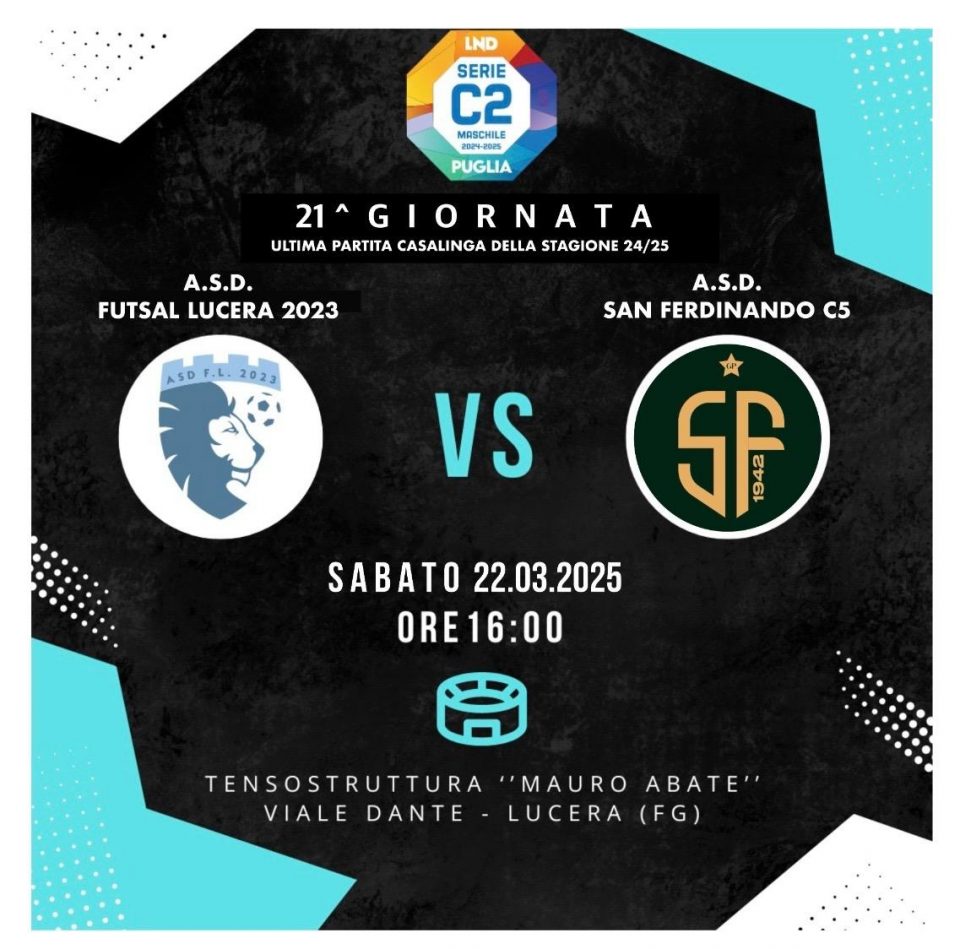 Sabato 22 marzo 2025 alle ore 16:00, presso la Tensostruttura “Mauro Abate” di Lucera (FG) in Viale Dante, va in scena l’ultima partita casalinga ASD FUTSAL LUCERA, impegnata nella 21^ giornata del campionato regionale pugliese di Serie C2, girone A, contro l’A.S.D. SAN FERDINANDO C5, squadra attualmente in lotta per la vittoria del campionato.