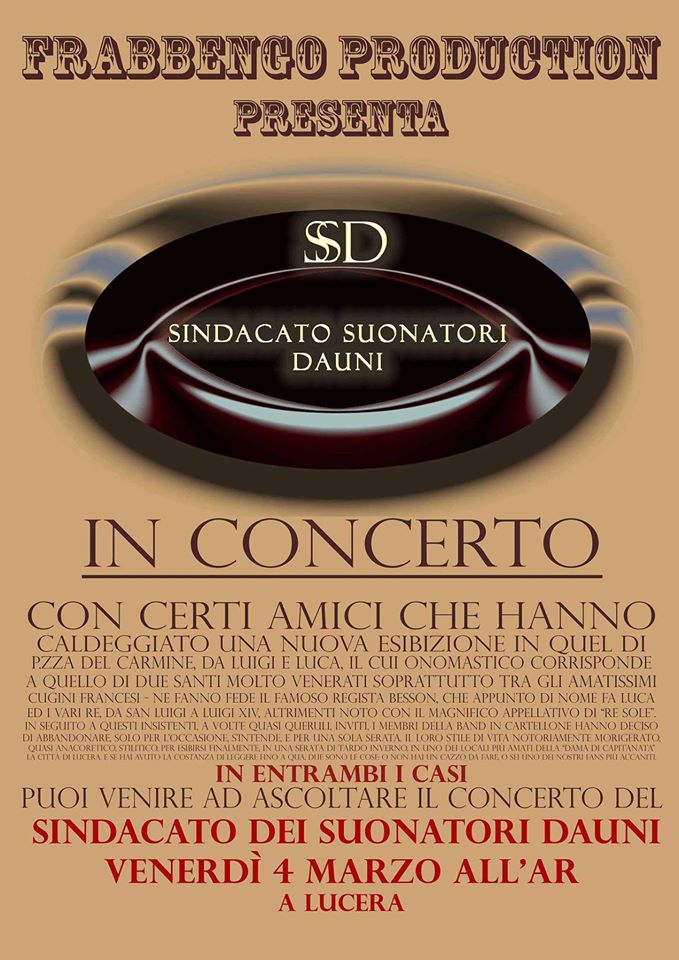 Si terrà il prossimo venerdì 4 marzo, alle ore 22.00, lo spettacolo musicale del “Sindacato dei suonatori dauni“, presso l’ Hostaria pub di Lucera.